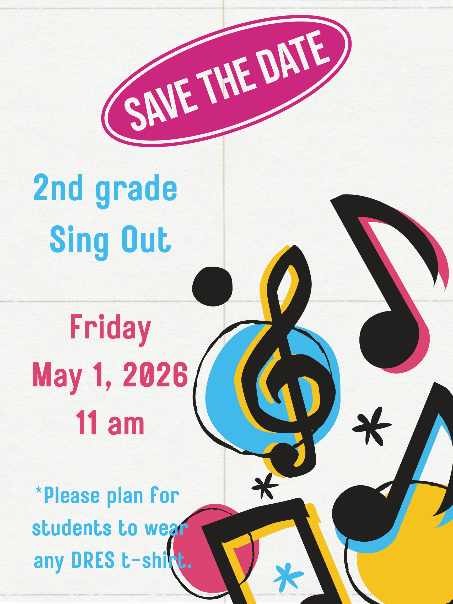 All 2nd grade students will present an end of the year program on Friday, May 1 at 11 a.m. We invite parents to join us for our second graders' last performance at DRES!